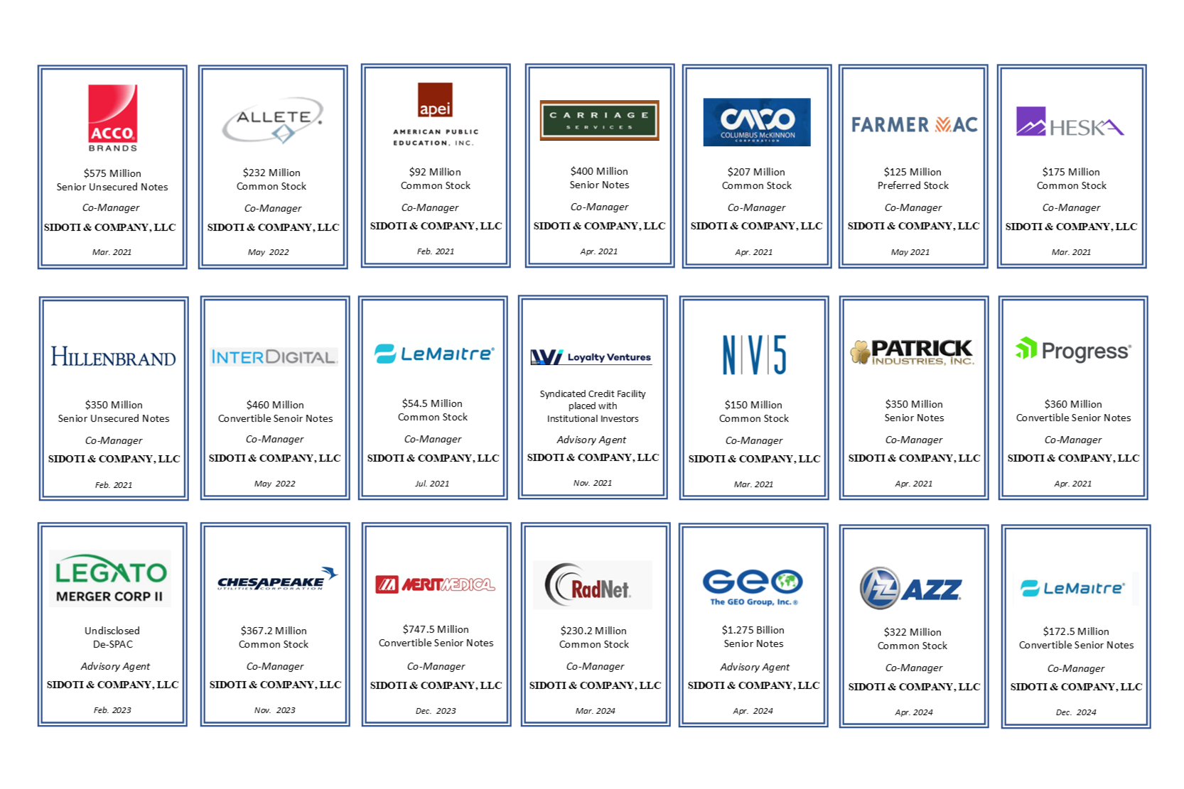 Sidoti has recently been asked by an increasing number of its covered companies to serve as a co-manager in their debt and equity financings. Since 2021, Sidoti participated in offerings involving nearly $4.7 million in debt and almost $2 billion in equity. Sidoti’s institutional sales force can be particularly helpful in placing securities with certain institutions which are less well covered by the large book running managers but with whom we interact with on a regular basis.